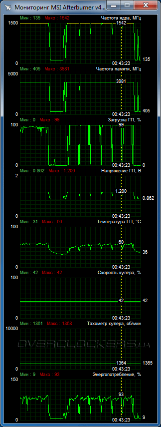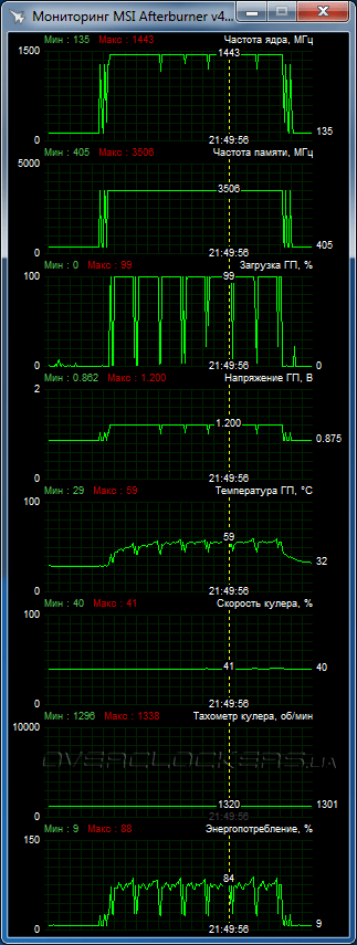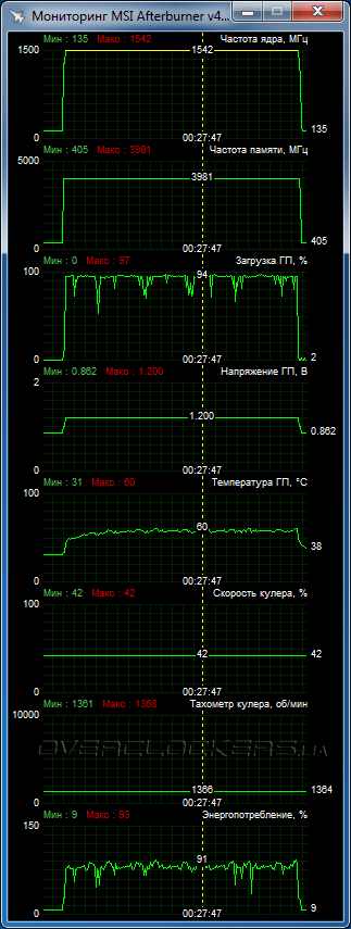 Реальная частота Boost постоянно держалась на пиковом уровне 1442 МГц. Это одно из самых высоких значений частоты у серийных видеокарт. Более внушительный Boost только у Gigabyte GV-N960G1 GAMING-2GD.