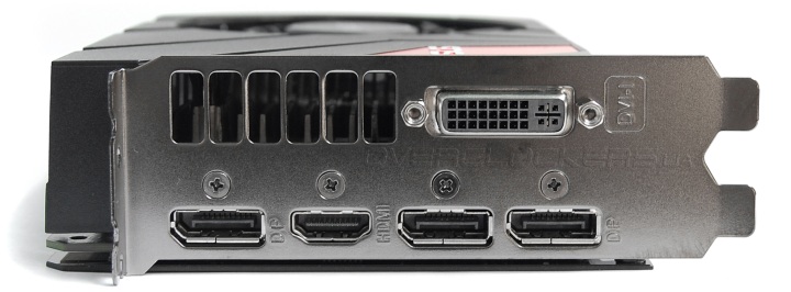 Набор интерфейсных разъемов стандартный: три DisplayPort, один HDMI и один DVI.