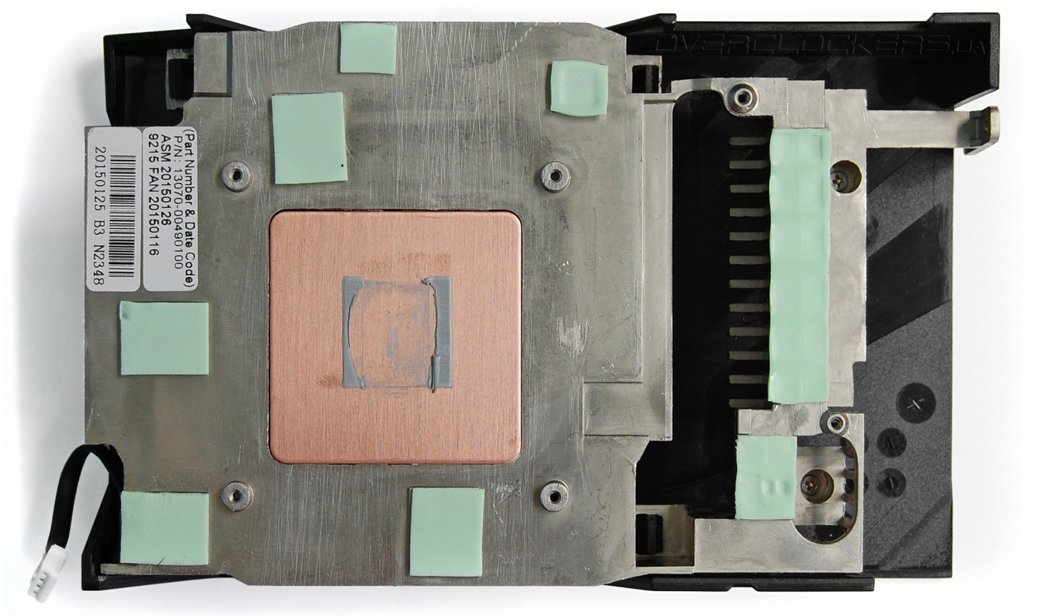 Массивное алюминиевое основание отводит тепло от силовых элементов на плате и микросхем памяти. Контакт с графическим ядром осуществляется через медную площадку.