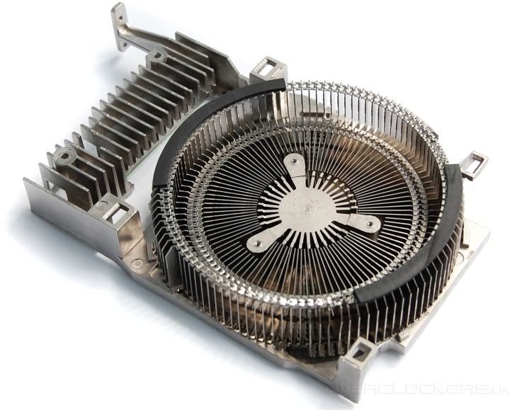 Система охлаждения полностью идентична той, что использовалась у старых карт. Левая часть массивного основания с крупным оребрением выступает радиатором для узла питания. На центральную часть напаян массив тонких пластин, образующих своеобразную «чашу», внутри которой размещен вентилятор.