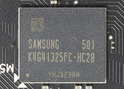 Два гигабайта памяти набраны восемью микросхемами Samsung K4G41325FC HC28, которые распаяны с двух стороны платы.