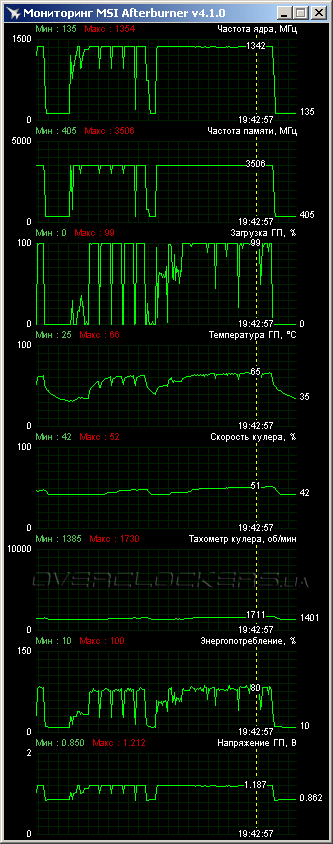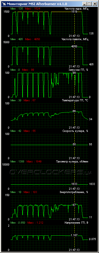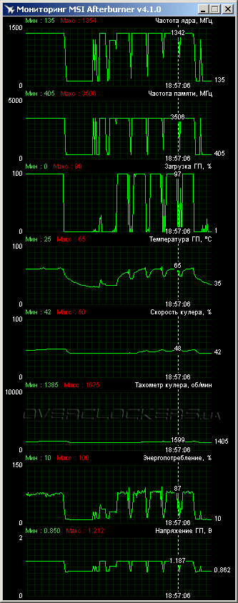 Частота ядра держалась на пиковом уровне Boost в 1519 МГц с редкими просадками на 12 МГц. Ручное повышение скорости вентилятора до 1850 об/мин позволило удержать рабочие температуры почти на начальном уровне.