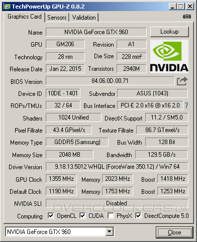 Результаты разгона полностью совпали с показатели прошлого участника наших обзоров — EVGA GTX 960 SSC. Весьма хороший результат, с учетом более простой PCB и более слабого охлаждения у ASUS. Ядро удалось разогнать по базовой частоте до 1355 МГц, память взяла рубеж в 8100 МГц.