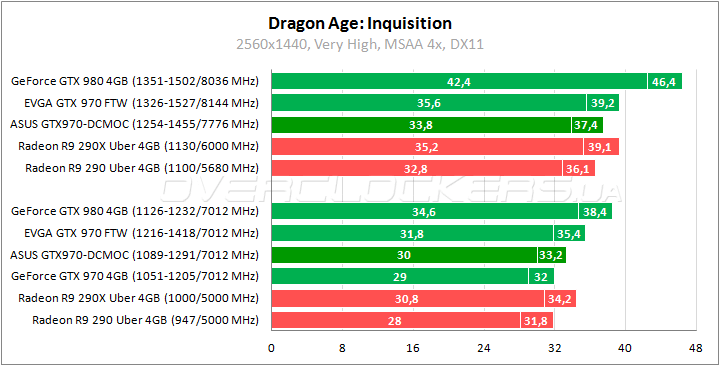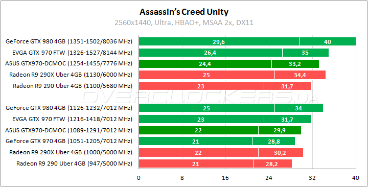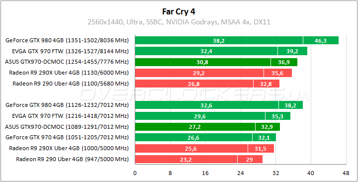 Пару процентов выигрывает герой обзора у референса в Far Cry 4. Преимущество над Radeon R9 290X на уровне 4–6%. Отставание от EVGA SSC примерно 8%. Разгон придает ускорение в 12–13%. Разница с EVGA при повышении частот сокращается до 5–6%.