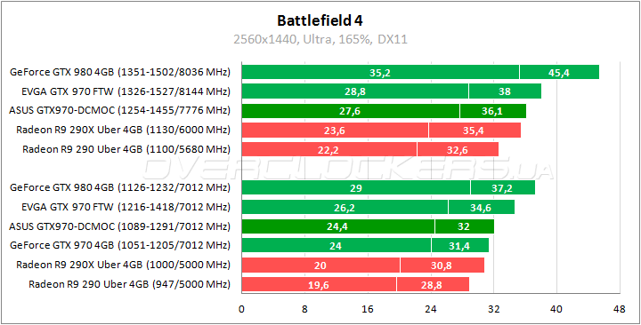 Минимальный перевес над референсом в Battlefield 4. Зато наблюдается хорошее преимущество над представителями AMD, особенно по минимальному fps. Разгон позволяет ускорить ASUS mini еще на 13%.