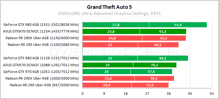 В GTA 5 простая версия GeForce GTX 970 немного уступает Radeon R9 290X в режиме Uber, а ASUS с заводским разгоном демонстрирует уже сопоставимую производительность. Разгон придает дополнительное ускорение в 10–13%.