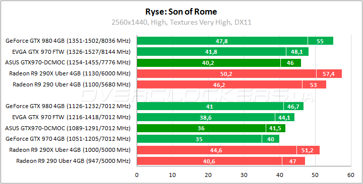 Ситуация резко меняется в Son of Rome. Тут уверенно лидируют представители AMD. ASUS в номинале быстрее на 3–4% референсного собрата и на 13% слабее Radeon R9 290. Разгон позволяет минимизировать отставание от младшего представителя AMD. При разгоне участников NVIDIA разница между ASUS и EVGA до 5% в пользу второго.