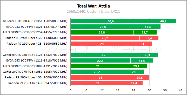 До 4% преимущества над референсом в последнем Total War при отставании 8–9% от EVGA FTW. Отставание от старшего представителя AMD на уровне 2–9%. Разгон повышает производительность ASUS mini на 12–13%.