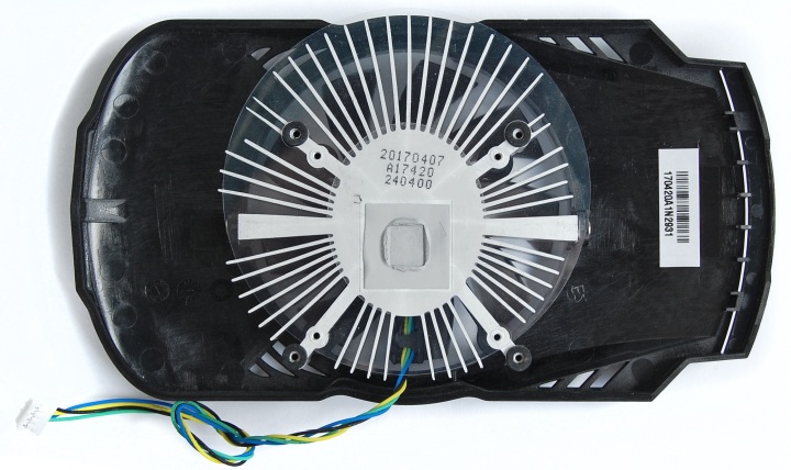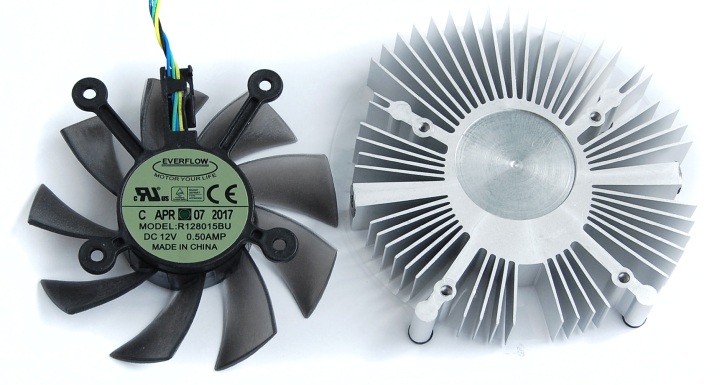 Круглый лучистый радиатор выполнен из цельного алюминия с дополнительным мощным сердечником в центре. Конструкцию можно назвать типовой, подобные радиаторы применяются во многих бюджетных видеокартах. Обдувается радиатор вентилятором Everflow R128015DU типоразмера 80 мм (диаметр крыльчатки чуть меньше).
