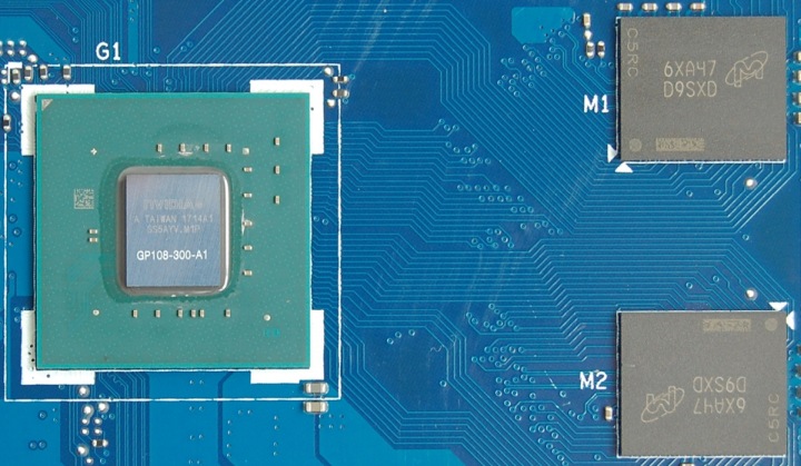 Полная маркировка графического чипа GP108-300-A1. Два гигабайта памяти набрано двумя микросхемами Micron 6XA47 D9SXD.