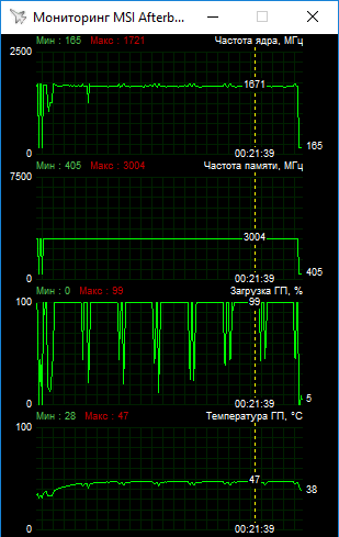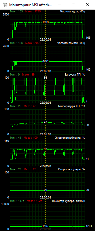 В соответствии с ожиданиями средняя Boost-частота оказалась выше заявленного уровня Boost Clock. В играх видеокарта работала на частоте около 1700 МГц с небольшими всплесками и отклонениями в меньшую сторону. Пиковые значения до 1785 МГц. При эксплуатации на открытом стенде с температурой 25-26 °C внутри помещения нагрев ядра в игровом режиме составил 47-48 °C. Вентилятор раскручивался лишь 1200 об/мин, создавая минимальный шум. Ниже это проиллюстрировано на скриншоте мониторинга параметров во время тестирования Tom Clancy's The Division.