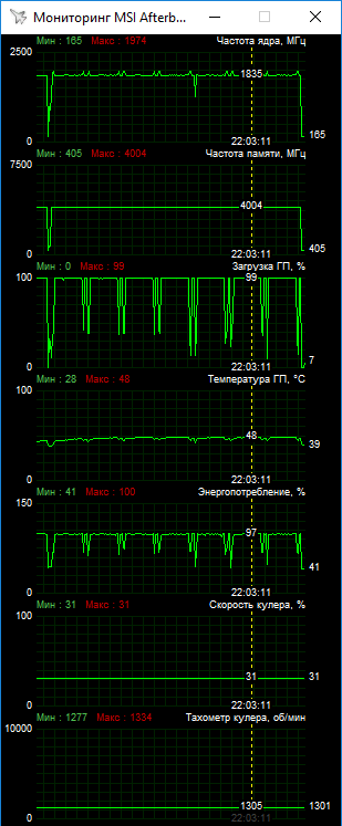 Средняя частота Boost составила около 1835 МГц, и поддерживалась на таком уровне даже в самых тяжелых играх. В более простых играх частота могла приближаться к 1850-1860 МГц, кратковременные пиковые значения до 1974 МГц. Это небольшой разгон относительно начальных частот, но он есть, и это неплохо. Положительным моментов является отличный разгон памяти до 8 ГГц. Возможно, чипы GDDR5 могли бы работать и при больших частотах, но на данной отметке мы уперлись в программные ограничения на повышение частот.