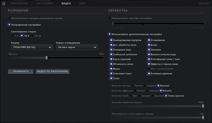 Проигрывалась запись одной из турнирных игр, выбран тестовый отрезок длиной в 70 секунд. Несколько повторов для уменьшения погрешности. Установлено максимальное качество графики, в ручном режиме дополнительно активировано максимальное качество теней. Наша конфигурация настроек отражена ниже.