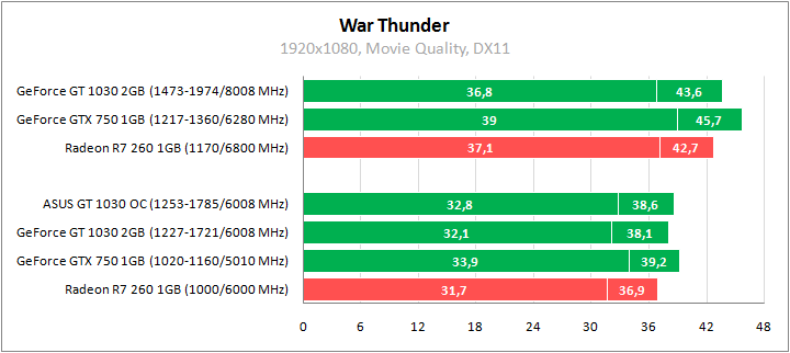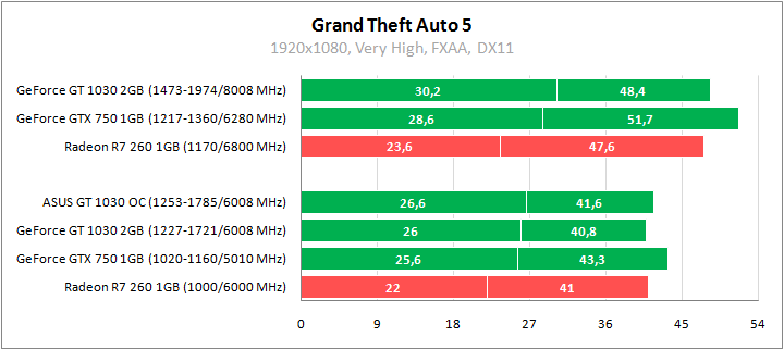 GeForce GT 1030 оказывается производительнее Radeon R7 260 в номинале, в разгоне они равны. Более высокие показатели у GeForce GTX 750. При повышенных частотах герой обзора обеспечивает более 40 fps при максимальной графике, что весьма неплохо. Для более высокого fps достаточно будет снизить настройки на один шаг.
