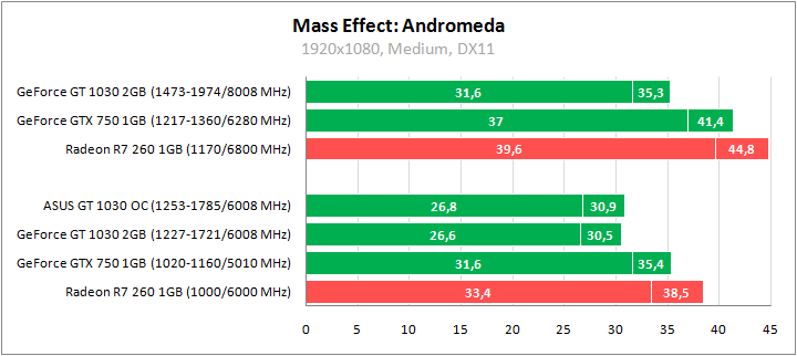 Andromeda является требовательно игрой. Средние настройки предусматривают рендеринг в 1600x900 с масштабированием до 1920x1080. Но даже в таком режиме GeForce GT 1030 едва выдает 30 fps, хотя с разгоном производительность доходит до 35 fps. При небольших дополнительных правках настроек можно будет играть более-менее сносно. Старые видеоадаптеры в данной игре демонстрируют явное преимущество, хотя GeForce GTX 750 в номинале показывает те же 35 fps.