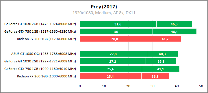 При некотором отставании в среднем fps у GeForce GT 1030 есть небольшое преимущество над GeForce GTX 750 по минимальному показателю. Оба видеоадаптера NVIDIA в Prey быстрее соперника от AMD. Разгон ускоряет GeForce GT 1030 на 16%.