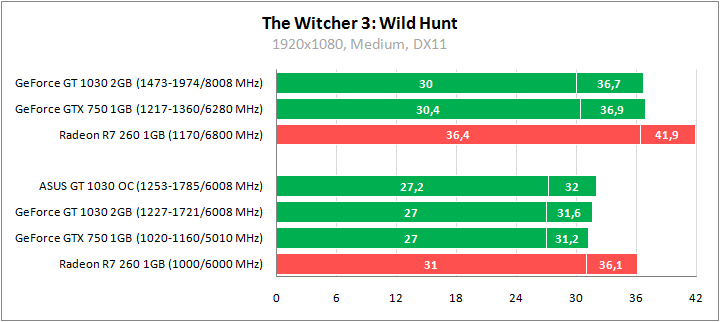 Максимально близкие результаты у GeForce GT 1030 и GeForce GTX 750 с небольшим перевесом в пользу новичка. Лидирует в Witcher 3 старый ускоритель Radeon R7 260, соперники NVIDIA нагоняют его при разгоне. Повышение частот обеспечивает GeForce GT 1030 рост результатов на 11–16%.