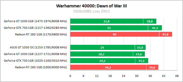 Новая часть Dawn of War является весьма требовательной к ресурсам ПК, но при минимальных настройках графики можно играть и на GeForce GT 1030. В номинале средняя частота лишь 33 fps, но разгон доводит ее до 39 fps. При начальных частотах новичок чуть проигрывает GeForce GTX 750, в разгоне разница более существенная. Radeon R7 260 с заметным отрывом впереди соперников NVIDIA.