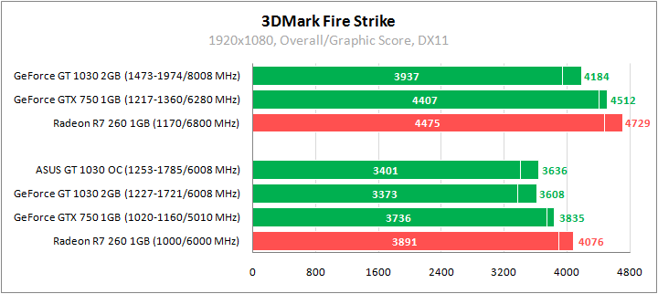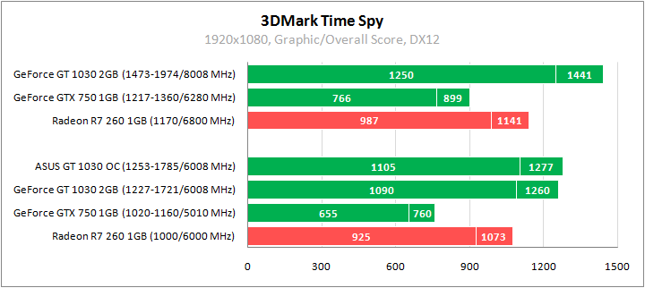 Ситуация резко меняется в Time Spy под DirectX 12. GeForce GT 1030 показывает самый высокий результат, обгоняя Radeon R7 260 на 18%, а отрыв от GeForce GTX 750 более 66%. Прирост от разгона менее 15%.