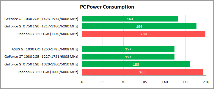 Самые низкие показатели потребляемой мощности у системы с GeForce GT 1030, разница с GeForce GTX 750 на уровне 26 Вт. Максимальное потребление у Radeon R7 260, но этот видеоадаптер и самый производительный.
