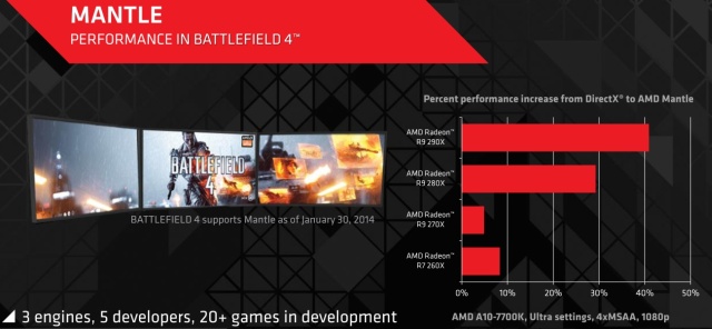 От себя отметим, что заметное ускорение этот API дает на слабых процессорах. Данные на верхнем слайде актуальны исключительно для платформы на базе AMD A10-7770K. На старших игровых процессорах Intel польза от Mantle может стремиться к нулю. Показательным может быть наше небольшое сравнение топовых Radeon в игре Thief, где в связке с разогнанным Core i7 никакого прироста от Mantle вообще не было.