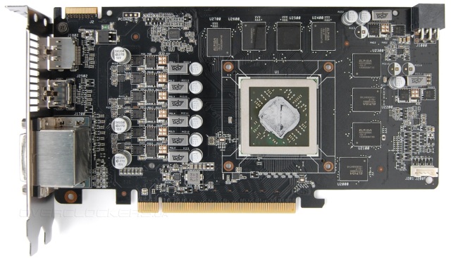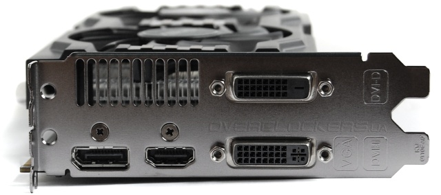 Охлаждение несколько выпирает над платой, которая на два сантиметра короче. Один из винтов, фиксирующих кулер, защищен гарантийной пломбой. Присутствует шестиконтактный разъем питания, который развернут защелкой вверх.