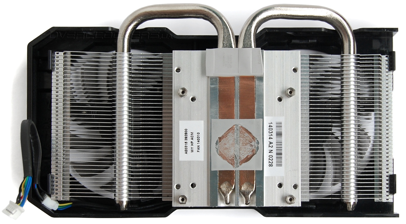 В основе конструкции охладителя — две толстые тепловые трубки диаметром 8 мм. Благодаря технологии прямого контакта они напрямую отводят тепло от поверхности графического кристалла.