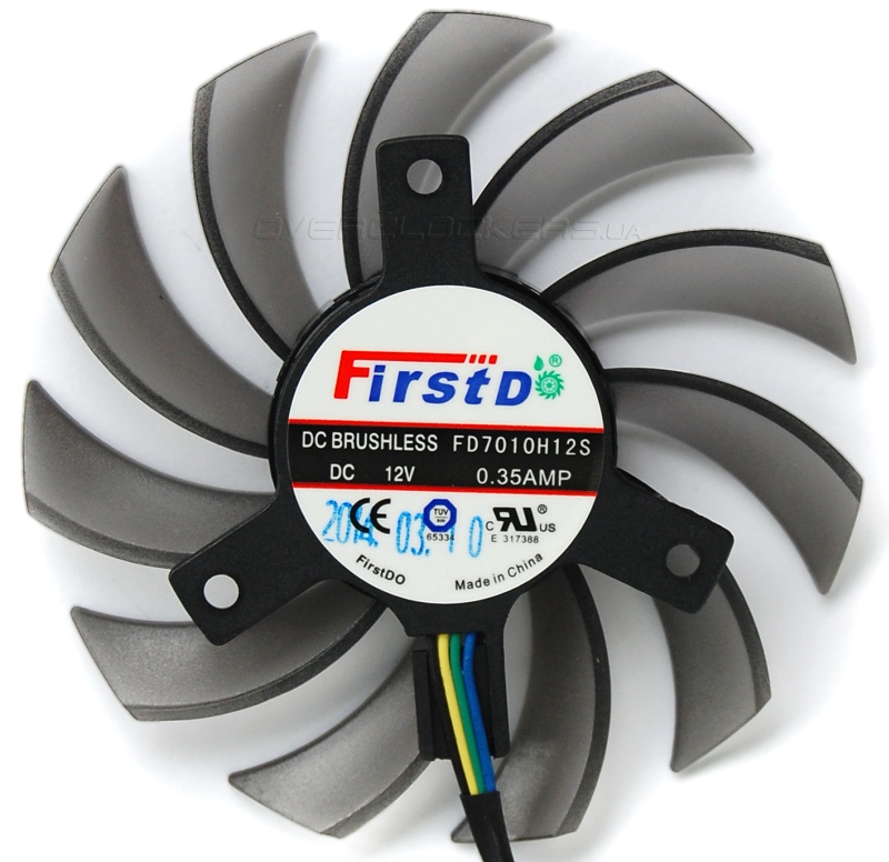 Верхний кожух с вентиляторами цепляется пластиковыми защелками прямо за края пластин. Маркировка вентиляторов FirstD FD7010H12S. Диаметр 80 мм (реальный размер крыльчатки примерно 75 мм).