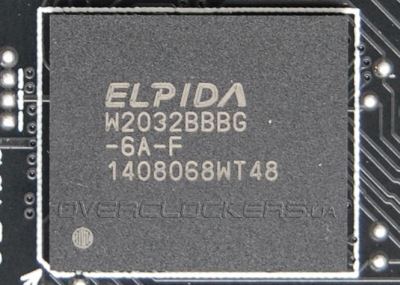 Два гигабайта памяти GDDR5 набраны восемью микросхемами Elpida W2032BBBG-6A-F.