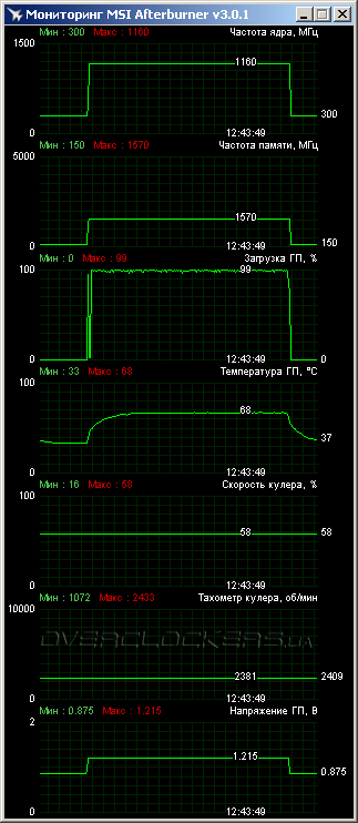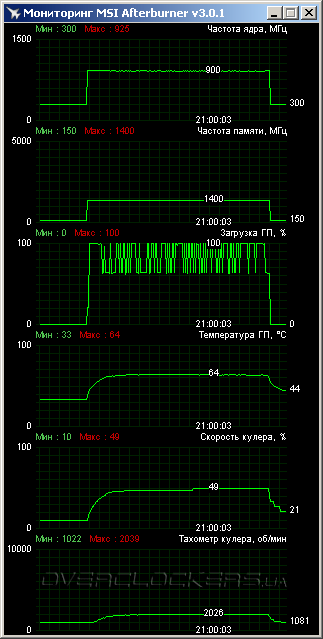 Периодически наблюдалось снижение частоты GPU с уровня 925 МГц до 900 МГц. Но в большинстве игровых приложений такого не было и в графе частоты ядра можно было наблюдать прямую ровную линию на 925 МГц.