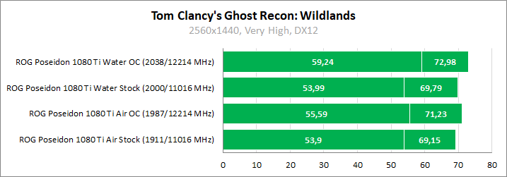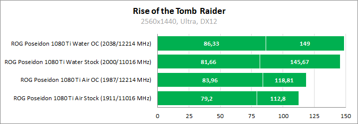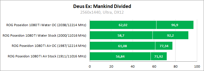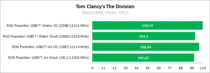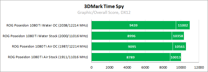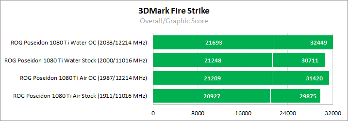 Для максимальной наглядности сравним относительно тихий режим работы ROG Poseidon GeForce GTX 1080 Ti в стоковом режиме с воздушным охлаждением и его же производительность, но уже при полной бесшумности и разгоне «под водой».