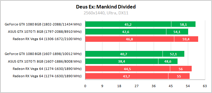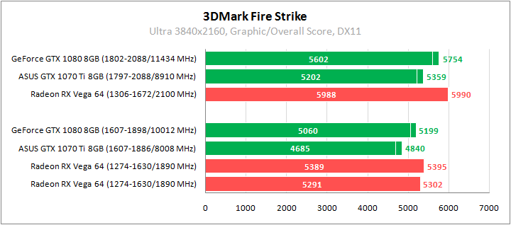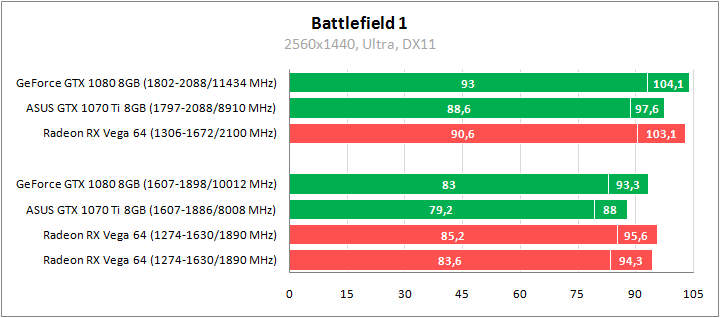 В обоих тестовых режимах разница между GeForce GTX 1070 Ti и GeForce GTX 1080 около 7%. Отставание от Radeon RX Vega 64 более заметное, но разгон позволяет его минимизировать.