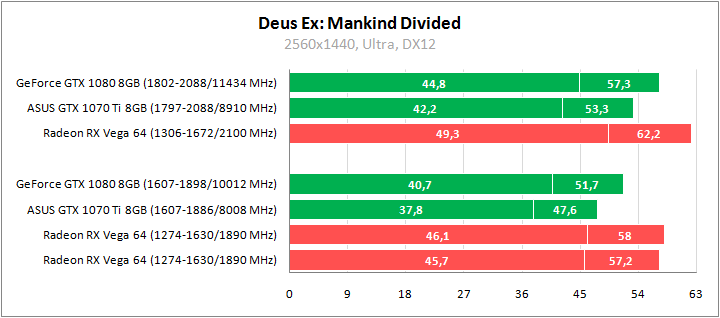 Ситуация в разных DirectX различается. Представители NVIDIA теряют производительность в новом API, а Radeon RX Vega 64 удерживает ее на одном уровне. Поэтому в DirectX 12 флагман AMD уходит в отрыв. GeForce GTX 1070 Ti уступает GeForce GTX 1080 около 5%, что легко компенсируется разгоном. Повышение частот позволяет обойти Radeon RX Vega 64 в DirectX 11.