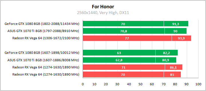 Результаты в For Honor требуют пояснений. Похоже, обновление игры несколько подняло производительность, и в сочетании с новым видеодрайвером это обеспечило хорошее ускорение Radeon RX Vega 64 относительно прошлых результатов. А вот GeForce GTX 1080 мы уже не имели на руках, поэтому включили в график данные тестирования на старом драйвере и в прошлой версии игры. И это, возможно, стало основной причиной идентичных показателей GeForce GTX 1070 Ti и GeForce GTX 1080 в данной игре. Поэтому ключевой вывод из данного сравнения в том, что флагман AMD заметно быстрее GeForce GTX 1070 Ti и, вероятно, уже производительнее GeForce GTX 1080.