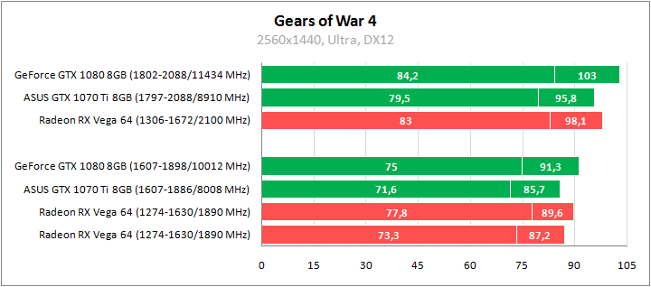 В Gears of War 4 новичок уступает старшему товарищу 5–6%, разгон ускоряет его на 11–12%. В номинале GeForce GTX 1070 Ti почти не уступает флагману AMD с экономичным BIOS, в повышение частот позволяет легко обойти соперника при стандартных настройках.
