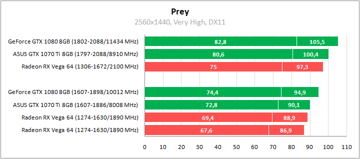 Скромная разница между двумя GeForce в Prey на уровне 2–5%. GeForce GTX 1070 Ti при начальных частотах чуть быстрее Radeon RX Vega 64. Разгон обеспечивает ускорение ASUS на 11%.