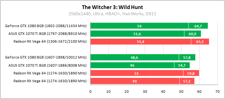 GeForce GTX 1070 Ti проигрывает старшему товарищу менее 6% в The Witcher 3, отставание от Radeon RX Vega 64 до 9%. Разгон позволяет улучшить показатели ASUS на 11–12%.