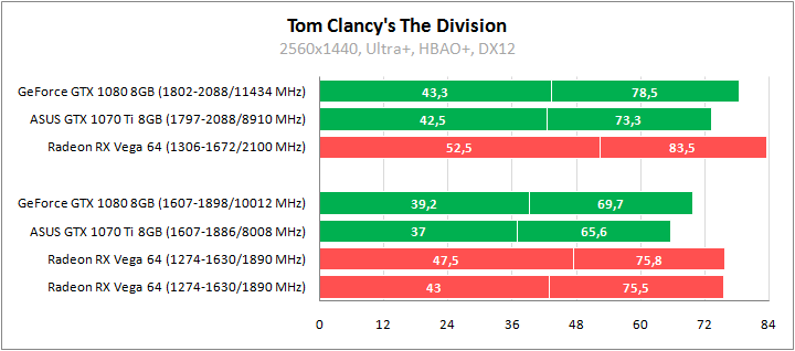 Максимальная разница между GeForce GTX 1070 Ti и GeForce GTX 1080 на уровне 5%, в DirectX 11 она меньше. Переход на в DirectX 12 снижает результаты новичка, хотя GeForce GTX 1080 держится на том же уровне — возможно, сказываются различия в версии драйверов и игры. Соперник AMD удерживает лидерство в обоих режимах. Переход на DirectX 12 только улучшает результаты Radeon RX Vega 64 в The Division.