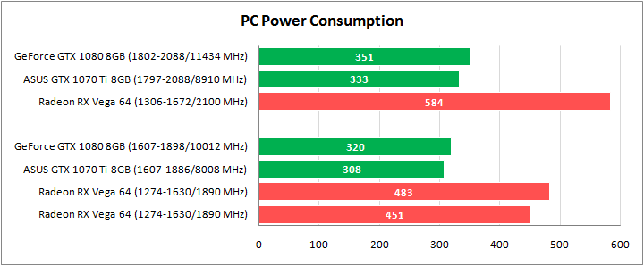 Система с GeForce GTX 1070 Ti потребляет на несколько ватт меньше в сравнении с GeForce GTX 1080. Разница с Radeon RX Vega 64 колоссальна.