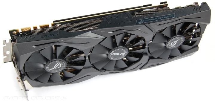 Новый Strix получил не только новый GPU, но и обновленный дизайн. Ранее компания уже выпускала видеокарты с кулером на три вентилятора, в том числе семейство старших Radeon. STRIX-GTX1080-O8G-GAMING отличается от них. Причем даже по наружному осмотру видно, что речь идет не только о внешнем корпусе, но и о внутренней конструкции охладителя.