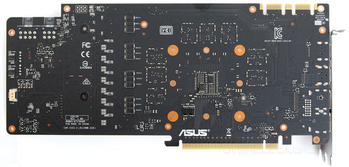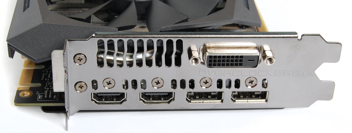 ASUS предлагает слегка отличную от стандартной конфигурацию разъемов на задней панели. Для удобства коммутации устройств виртуальной реальности VR выведено два разъема HDMI. Обычно он у GeForce GTX 1080 один. HDMI дополняет пара разъемов DisplayPort и один DVI.
