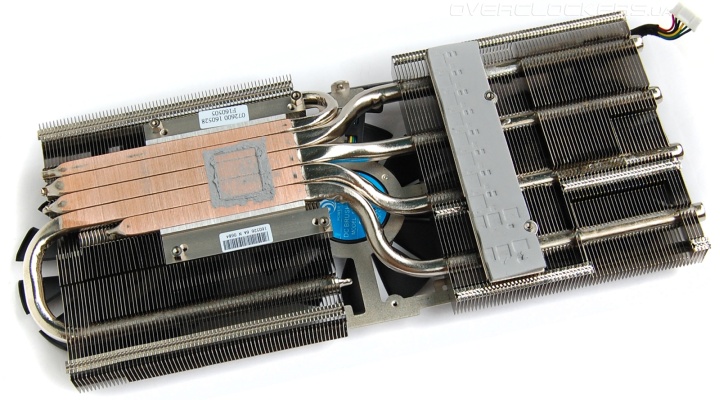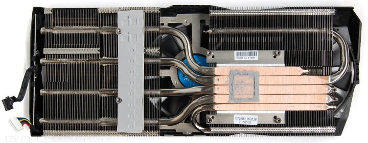 Теперь изучим особенности конструкции системы охлаждения. В ней задействовано пять тепловых трубок, четыре из которых увеличенного диаметра 8 мм. В основании трубки плотно подогнаны друг к другу и напрямую контактируют с графическим процессором. По отпечатку видно, что кристалл полностью накрывают три трубки и совсем немного четвертая. Самая тонкая трубка остается не удел, но она помогает в общем теплообмене.