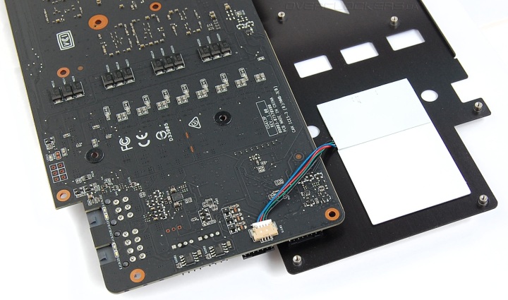 Обратная сторона закрыта металлической пластиной с геометрическим рисунком и прорезями под крупные элементы на плате. Тут же присутствует большой подсвечиваемый логотип ROG. В углу вместо одного разъема питания два — на 8 и 6 контактов.