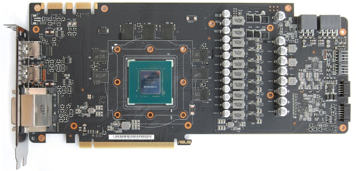 Количество фаз питания GPU наращено до восьми, память GDDR5X запитана от двух фаз. Удобно расположены все разъемы для подключения вентиляторов и подсветки, они развернуты параллельно к плоскости платы. Рядом находится два специальных разъема ASUS FanConnect, которые позволяют подключить к видеокарте корпусные вентиляторы, чтобы их скорость регулировалась в зависимости от нагрева графического чипа.