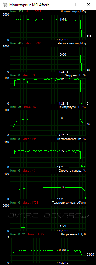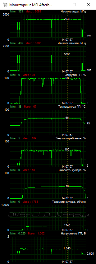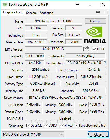 На фоне рекордных начальных частот можно ожидать выдающихся показателей в разгоне. На самом деле данная видеокарта в очередной раз подтвердила наш тезис, что разгон GPU у всех GeForce GTX 1080 примерно на одном уровне. Базовая частота была увеличена до 1805 МГц при пиковом Boost 2101 МГц. Напряжение GPU повышено на один шаг, что обеспечило стабилизацию в некоторых приложениях. Дальнейшее повышение напряжения и частот приводило к сбоям.