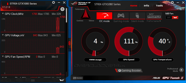 ASUS Strix Gaming поддерживает три частотных профиля. Наш экземпляр по умолчанию работает при базовой частоте 1785 МГц с Boost Clock 1936 МГц, что соответствует профилю OC Mode. Розничные версии по умолчанию могут работать при частотах 1759/1898 МГц (Gaming Mode). Память во всех режимах соответствует стандартным спецификациям — 10 ГГц.