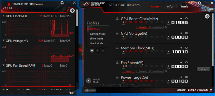 Смена режима осуществляется через программу ASUS GPU Tweak. После запуска программы сразу открывается меню с выбором профиля, где достаточно кликнуть по соответствующей иконке для смены частот.
