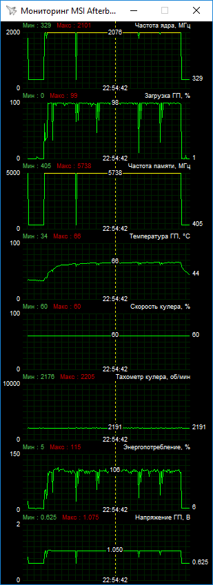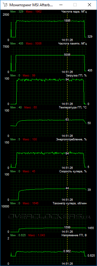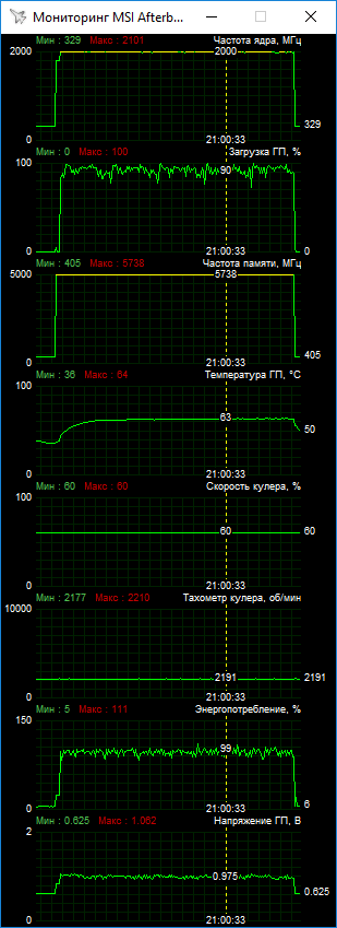 Если нужно снизить скорость вентиляторов и шум до минимума, можно переключить видеокарту в Silent Mode. Частоты в таком режиме близки к стандартным. В Metro среднее значение Boost было меньше 1900 МГц, а скорость вращения вентиляторов держалась на уровне 1600 об/мин.