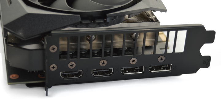 Хорошо видно, что задействовано три тепловые трубки. Это меньше, чем у ASUS ROG Strix RTX 2060, да и радиатор поменьше. Но даже такая конструкция выглядит внушительно для видеокарты с TDP 120 Вт. И кулер по габаритам больше охлаждения видеокарт MSI GTX 1660 Ti Gaming. У актуальных решений Strix ровное полированное основание для контакта с GPU. Также можно рассмотреть, что вся плата накрыта черной пластиной, которая является радиатором для силовых элементов и микросхем памяти.