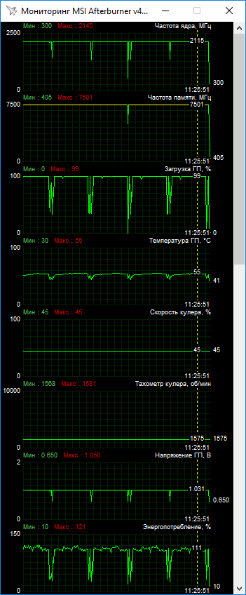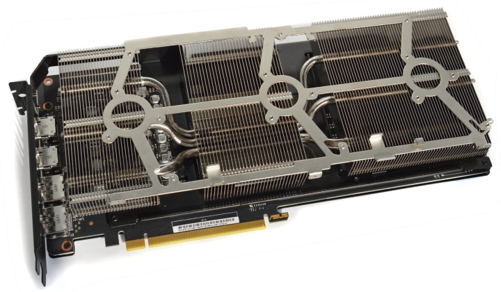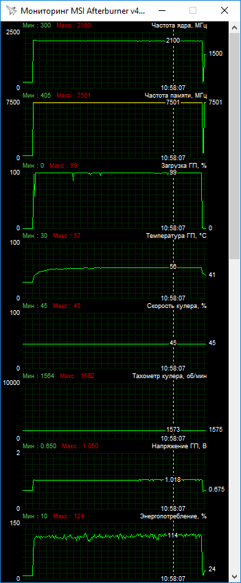 При фиксации скорости вентиляторов на 45% (меньше 1600 об/мин) итоговые температуры оказались ниже 60 °С. То есть разгон не связан с заметным повышением нагрева и шума, конечный пользователь может разгонять видеокарту при сохранении полного комфорта в использовании.